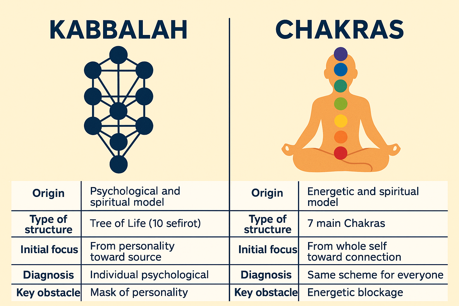 A fundamental difference with Kabbalah is the seven types of psychological qualities it uses to describe personal characteristics. While chakras present a unique design for all human beings, regardless of their personality style, Kabbalah allows, through numerological calculation, to typify the psychological type of each Being.